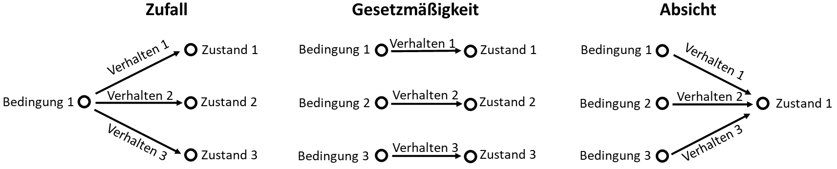 (Zufall bedeutet im direkten Vergleich dazu einfach nur, die Bedingung nicht bzw. nicht vollständig zu kennen. Zufall: Bedingung ⇒ Konsequenz)